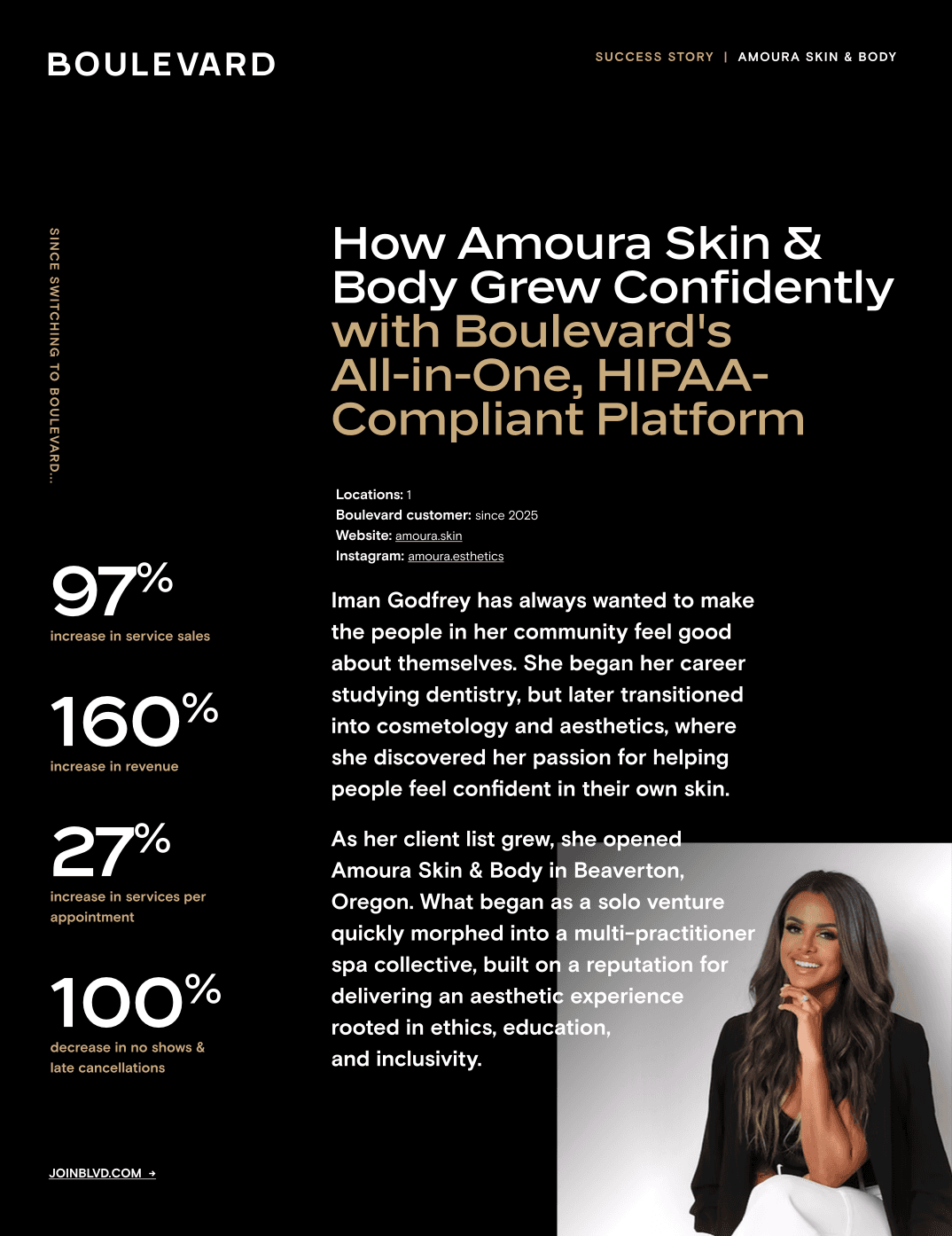 Iman Godfrey built Amoura Skin & Body on a commitment to confidence, care, and an elevated client experience. As her business grew, she needed a platform that could grow with her. After switching to Boulevard, Iman saw notable improvements in service sales and a smoother, more intuitive workflow that let her focus on what she loves most—helping clients feel their best. With automation, HIPAA-compliant forms, and clean design, Boulevard became a true partner in her growth.